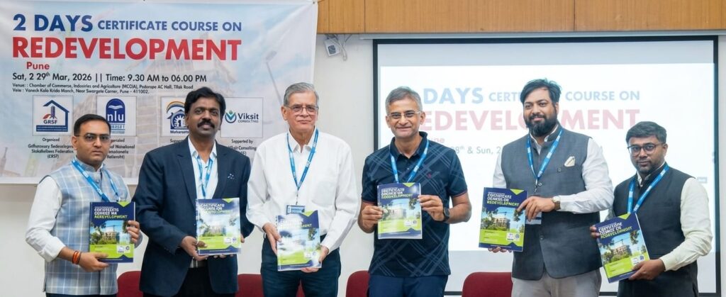 पुणे, दि. ७ – पुनर्विकास करताना आवश्यक सर्व कायद्यांचे पालन करत सभासदांचे हित जपले जाईल आणि त्याचबरोबर शहराचे सौंदर्यही अबाधित राहील याची काळजी घ्यायला हवी, अशी अपेक्षा क्रेडाई इंडियाचे उपाध्यक्ष रणजित नाईकनवरे यांनी आज येथे व्यक्त केली. शहराच्या रिअल इस्टेट क्षेत्राला नवी दिशा देण्यासाठी गृहहार्मनी रिडेव्हलपमेंट स्टेकहोल्डर्स फेडरेशन (GRSF) आणि महाराष्ट्र नॅशनल लॉ युनिव्हर्सिटी (MNLU) यांच्या संयुक्त विद्यमाने पुनर्विकासावरील दोन दिवसीय विशेष प्रमाणपत्र अभ्यासक्रम शिबिर पुण्यात नुकतेच आयोजित करण्यात आले होते, त्यावेळी ते बोलत होते. यावेळी व्यासपीठावर पुणे जिल्हा सहकारी गृहनिर्माण संस्था आणि अपार्टमेंट फेडरेशनचे अध्यक्ष सुहास पटवर्धन उपस्थित होते.